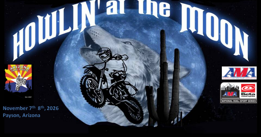 The Arizona Trail Riders are proud to host the 17th annual “Howlin at the Moon” AMA National Dual Sport event on November 7th and 8th, 2026, in Payson, Arizona.